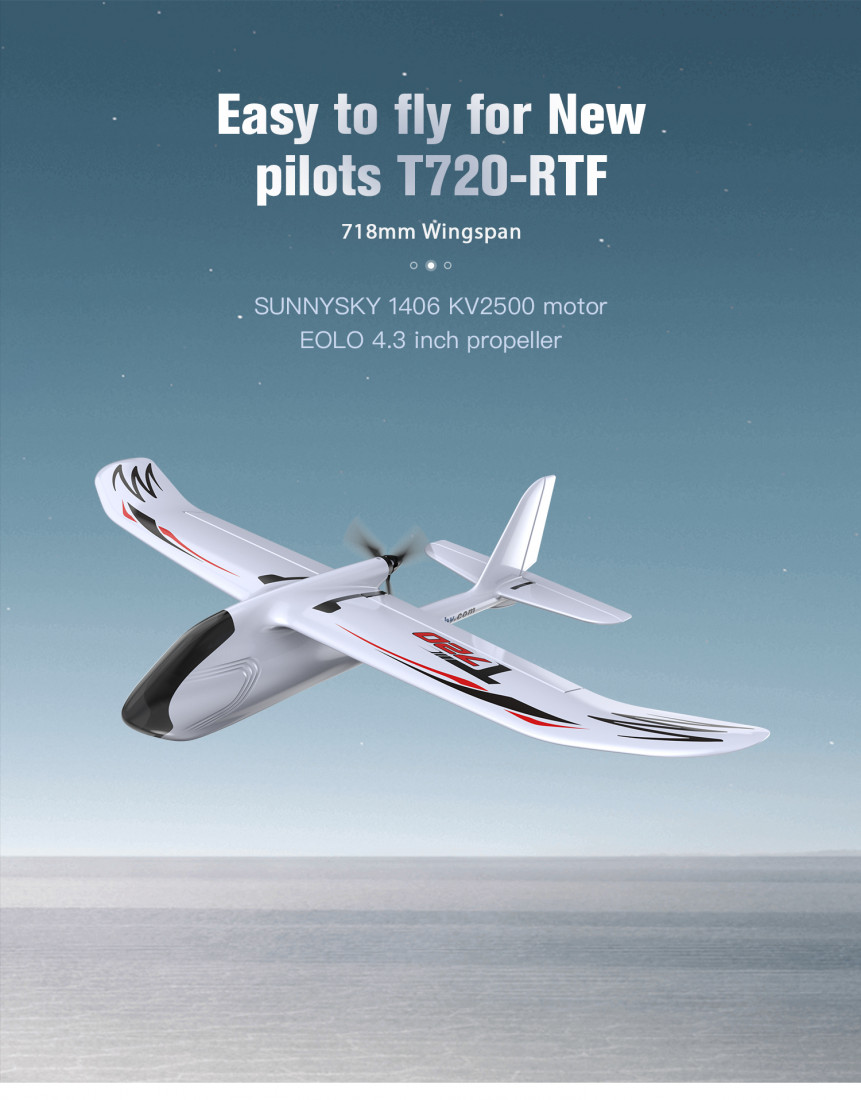 #Poslat dotazKompletně sestavený RC elektrovětroň o rozpětí 716 mm vyrobený z lehkého a snadno opravitelného pěnového materiálu EPO. Model je dodáván s nainstalovaným střídavým motorem 1404, 3 servy, řídící jednotkou a 10A regulátorem otáček. Model disponuje stabilizací, která zajistí přímý let i při výpadku rádiového spojení. Součástí balení je vysílač v módu 2 (plyn na levé ruce), pohonný LiPo akumulátor 7,4 V s kapacitou 300 mAh a USB nabíječ.